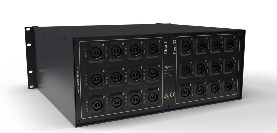 The proven motionfiber “Hot Patch” system offers maximum flexibility and enables latency-free distribution of all signals between the distribution points. Within the integrated patch panel, MTP connections are converted – similar to a fan-out – into duplex LC connections. On the rear side, the breakout is realized via QSEAL2 chassis connectors, which are fully compatible with duplex LC patch cables as well as Neutrik opticalCON DUO. This allows for clean, structured, and fast device cabling.